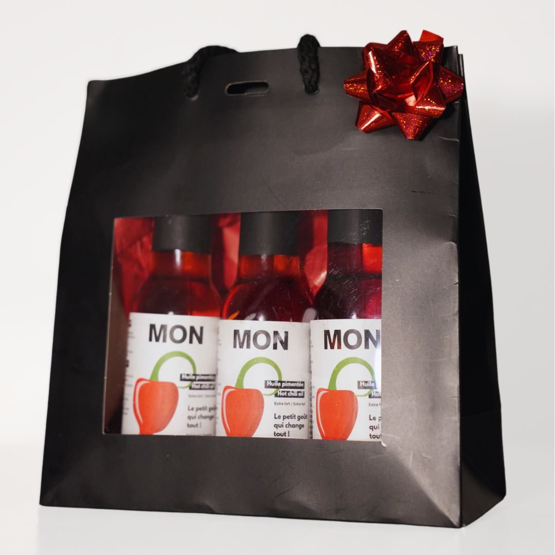 Le Coffret cadeau « Ensemble c’est tout » comprend 3 huiles pimentées. Idéal pour offrir comme cadeau de Noël aux personnes que vous aimez et qui adorent le piment à tel point qu’un repas sans piment ne fait pas sens. Offre-lui ce coffret et il pourra emmener MonPiment huile pimentée partout au boulot, en voyage, chez des amis, chez la famille, la belle-famille, au resto. Il suffit de le glisser dans le sac ou dans la poche et le tour est joué. Dans la cabine d’avion, c’est ok, sa taille est tout juste 100ml.